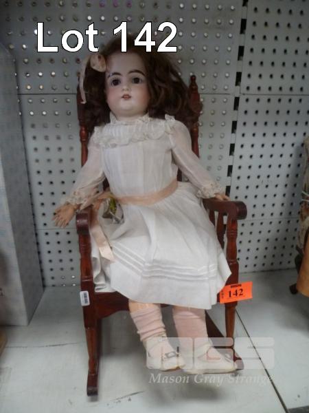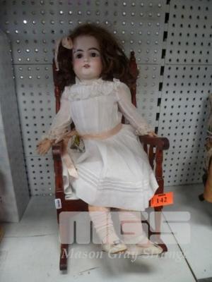 PORCELAIN DOLL, YOUNG GIRL IN WHITE DRESS IN DOLLS ROCKING CHAIR