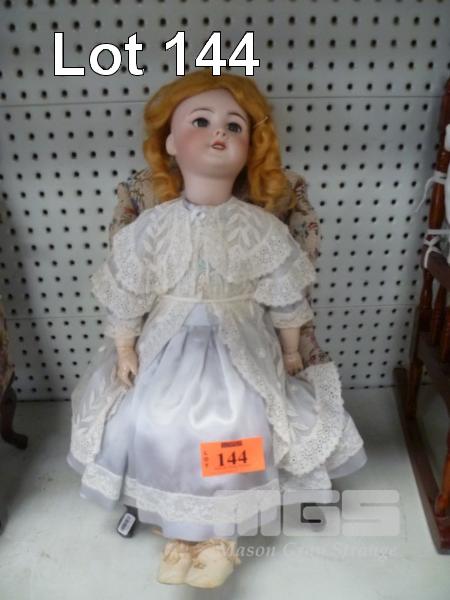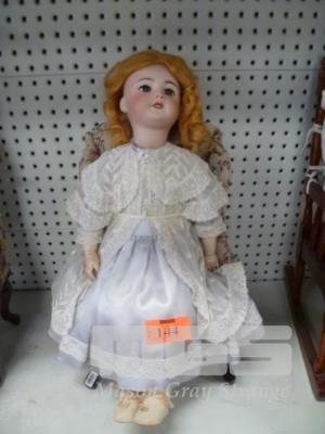 PORCELAIN DOLL, YOUNG GIRL IN BLUE/WHITE OUTFIT IN TAPESTRY ARM CHAIR
