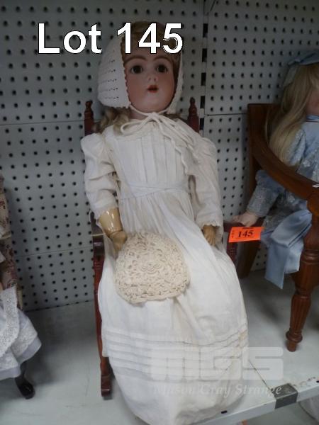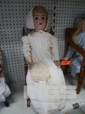 PORCELAIN DOLL, YOUNG GIRL IN WHITE DRESS ON DOLLS CHAIR
