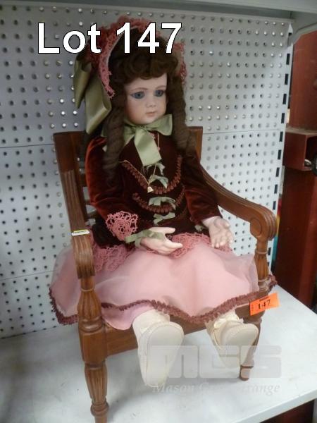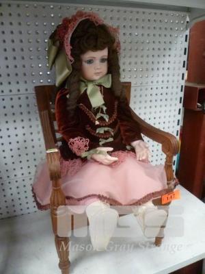 PORCELAIN DOLL, YOUNG GIRL IN BURGUNDY OUTFIT ON DOLLS ARM CHAIR