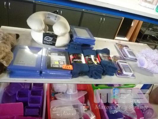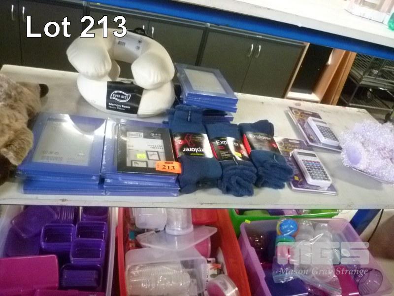ASSORTED ITEMS INCLUDING EXPLORER SOCKS , PHOTO FRAMES, NECK PILLOW, QUILTERS FABRIC CALCULATORS ETC (1 X SHELF)