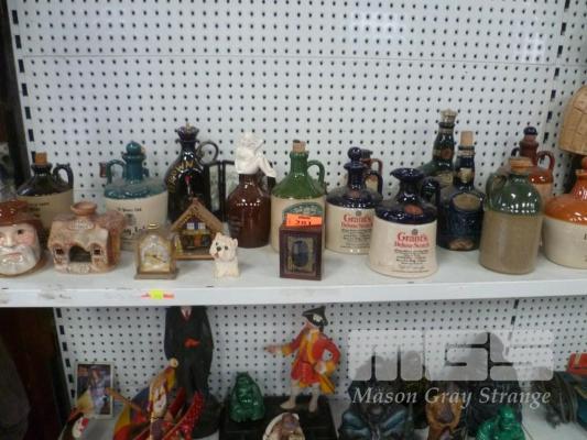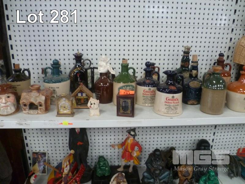 ASSORTED STONEWARE & GLAZED SCOTCH DECANTERS, SWIZA CARRIAGE CLOCK ETC
