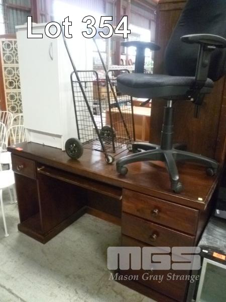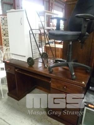 PINE OFFICE DESK, OFFICE CHAIR, SHOPPING TROLLEY & WHITE LAMINATE CABINET