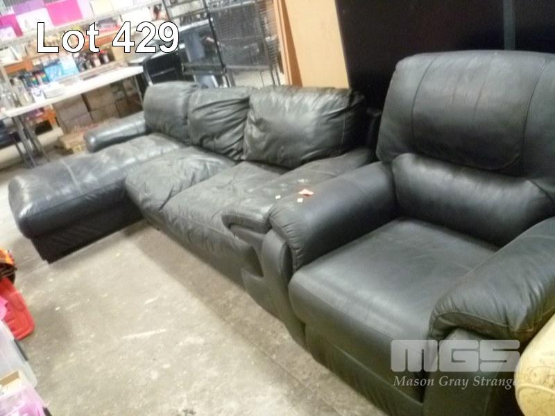 BLACK LEATHER L-SHAPE MODULAR LOUNGE, WITH BLACK RECLINER