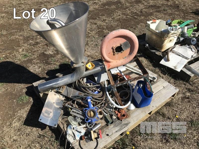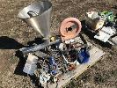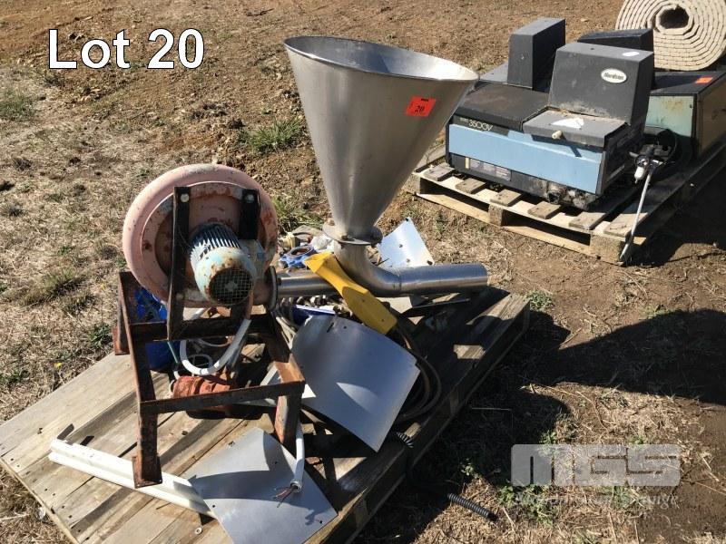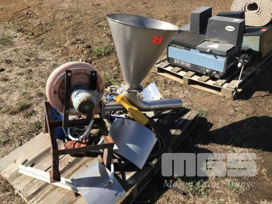 STAINLESS STEEL CONICAL HOPPER, 500m DIAM ELECTRIC BLOWER ON STAND WITH ASSORTED FITTINGS