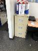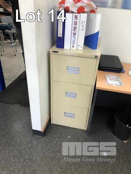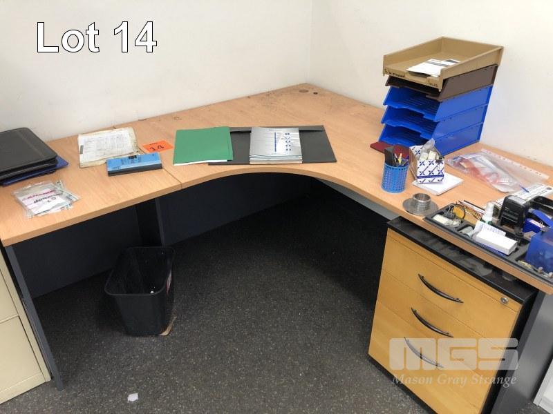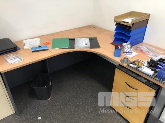 TIMBER LAMINATE CORNER DESK DRAWER DESK, BEACH & STORM, 1800 x 1800mm WITH 3 DRAWER MOBILE, GAS LIFT OFFICE CHAIR, 3 DRAWER STEEL FILING CABINET (NO KEY)