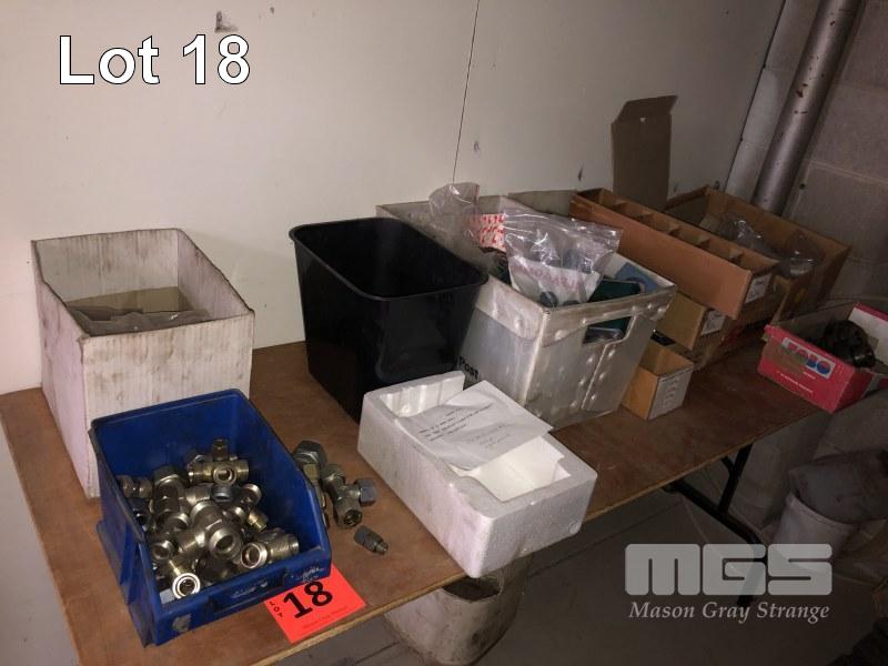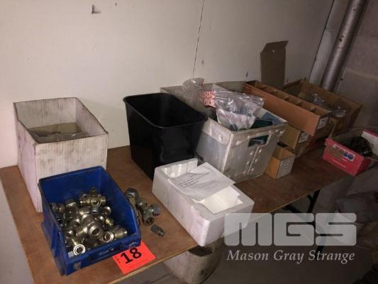 LARGE QUANTITY ASSORTED NYLON HYDRAULIC CLAMPING BRACKETS, VARIOUS SIZES, HYDRAULIC FITTINGS, ASSORTED 6-8mm BOLTS, DRIVE COUPLERS