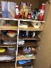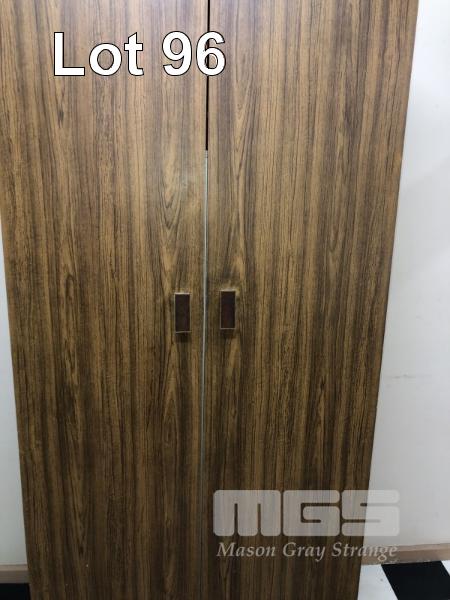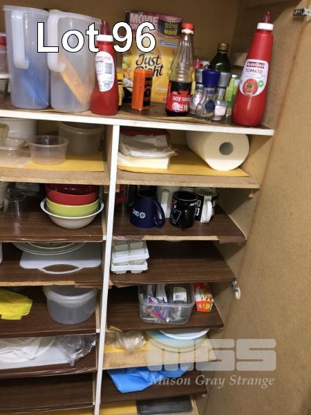 DINING TABLE 1500 x 900mm, WITH 4 TIMBER CHAIRS WITH 2 DOOR TIMBER LAMINATE CUPBOARD & CONTENTS