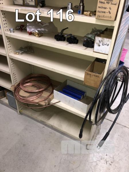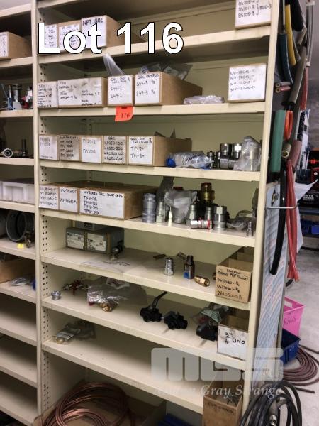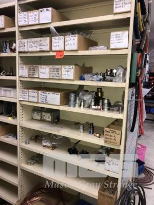 CONTENTS OF BAY, LARGE QUANTITY HYDRAULIC QUICK RELEASE FITTINGS & CAPS, ALFAGOMMA, FOSTER, PARKER, COPPER TUBING, THREAD TAPE, 3 WAY VALVES ETC.