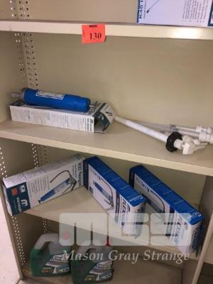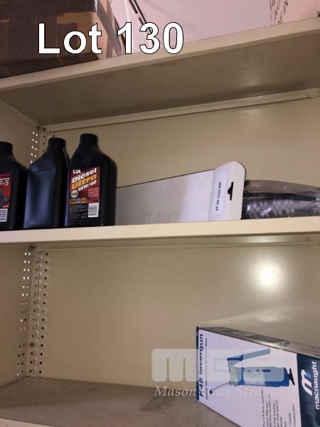 CONTENTS OF BAYS, McNAUGHT GREASE GUNS, DISPENSER PUMPS, 2 x 4L LONG LIFE COOLANT, 3 BOTTLES ASSORTED TRANS & ENGINE OILS