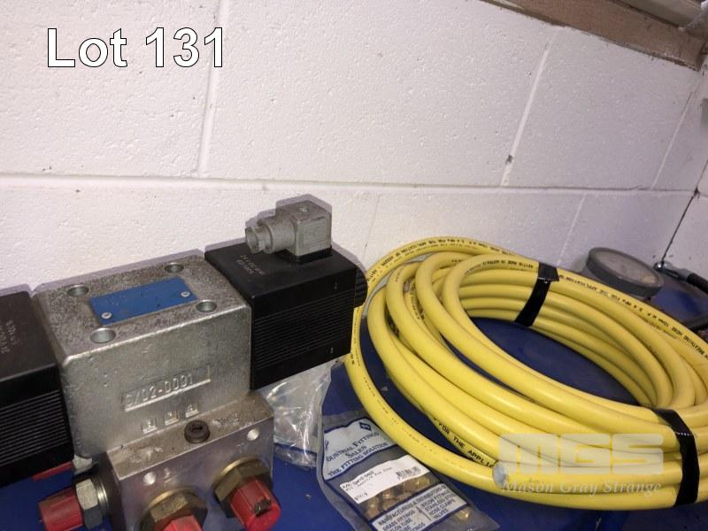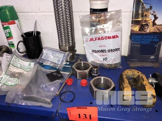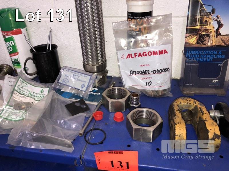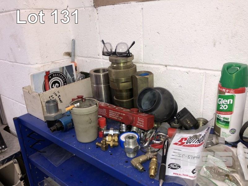 CONTENTS OF TOP SHELVES, ASSORTED HYDRAULIC PARTS & FITTINGS, AIR HOSE, SOLENOID VALVES, BRASS FITTINGS, ETC.