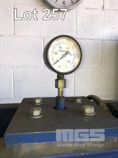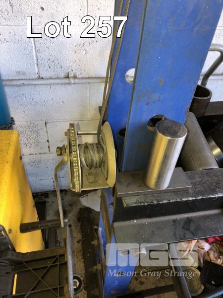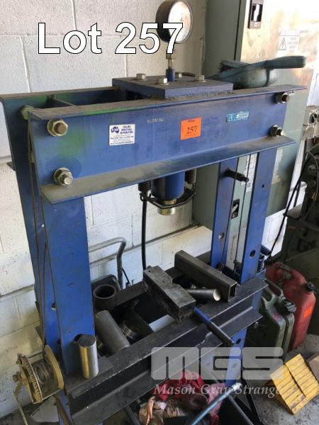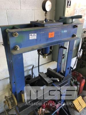BLUE POWER HYDRAULIC WORKSHOP PRESS, DUAL PUMP, ADJUSTABLE HEIGHT TABLE & PRESS BLOCK FITTED WITH LIFT WINCH