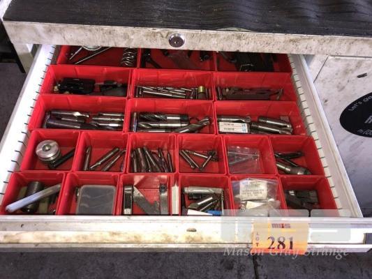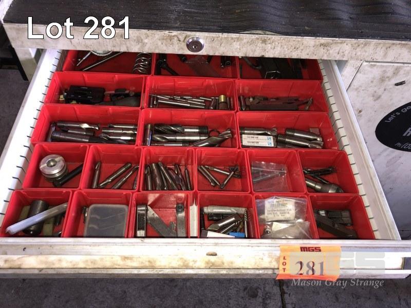 LARGE QUANTITY END MILLS, LATHE TOOL STEEL,THREAD GAUGES, CENTRE DRILLS, CONTENTS DRAWER