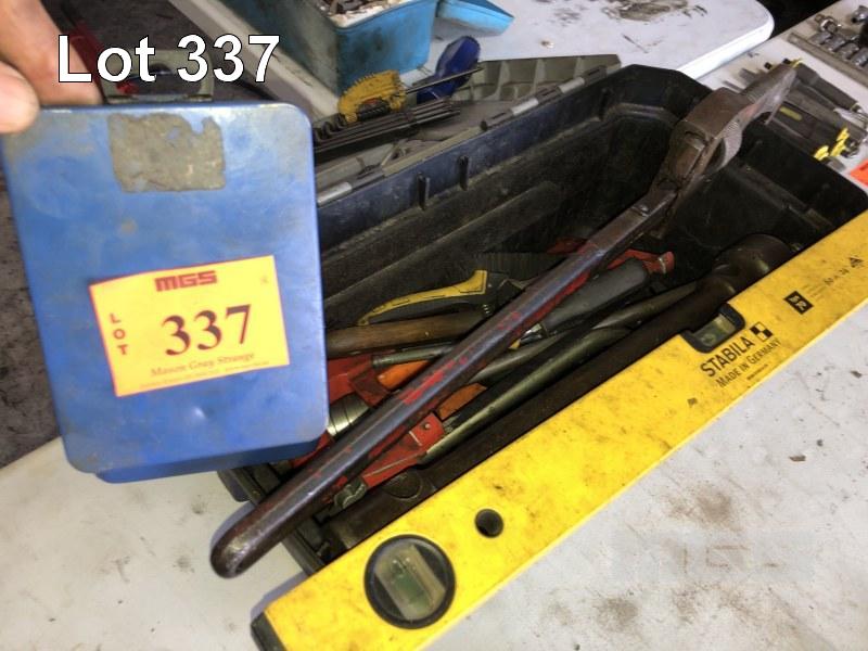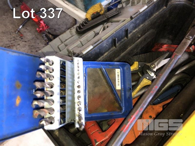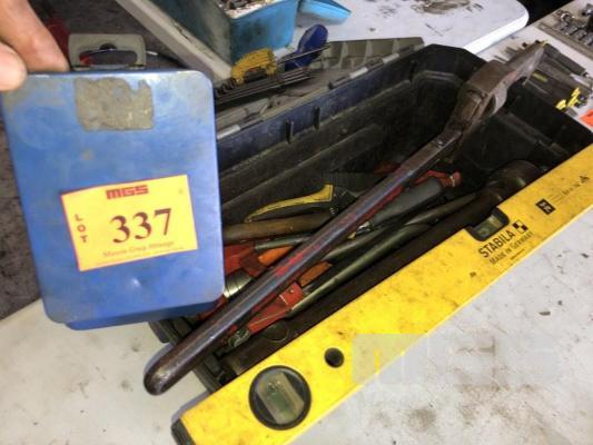 TOOL BOX & CONTENTS INC HACKSAW, SNIPS, SCREWDRIVERS, DRILL SET, KEYS, ETC