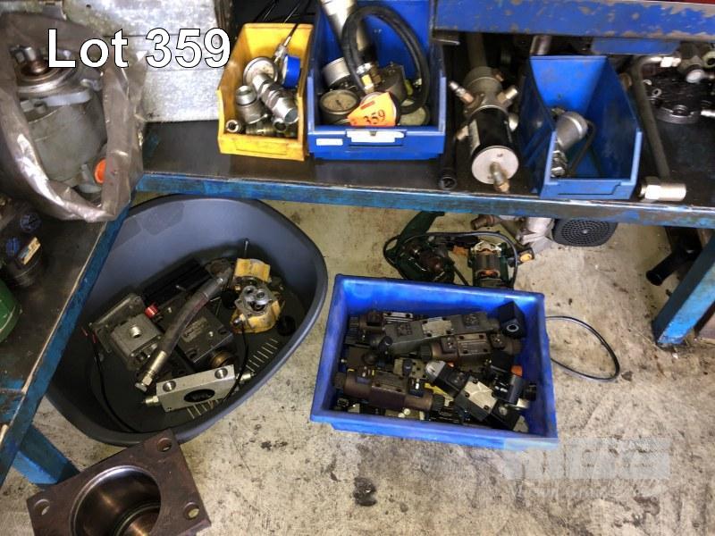 ASSORTED HYDRAULIC PUMPS, FITTINGS & TOOL BOX UNDER BENCH