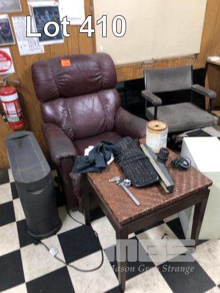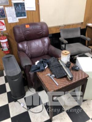 LOUNGE CHAIR, COFFEE TABLE, OFFICE CHAIR, FIREPROOF CABINET, TV, ALL FAULTS & FRIDGE