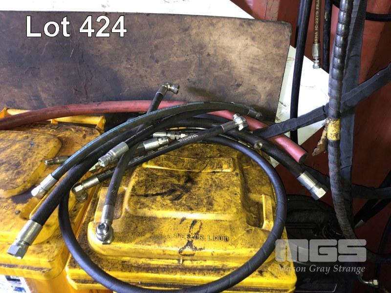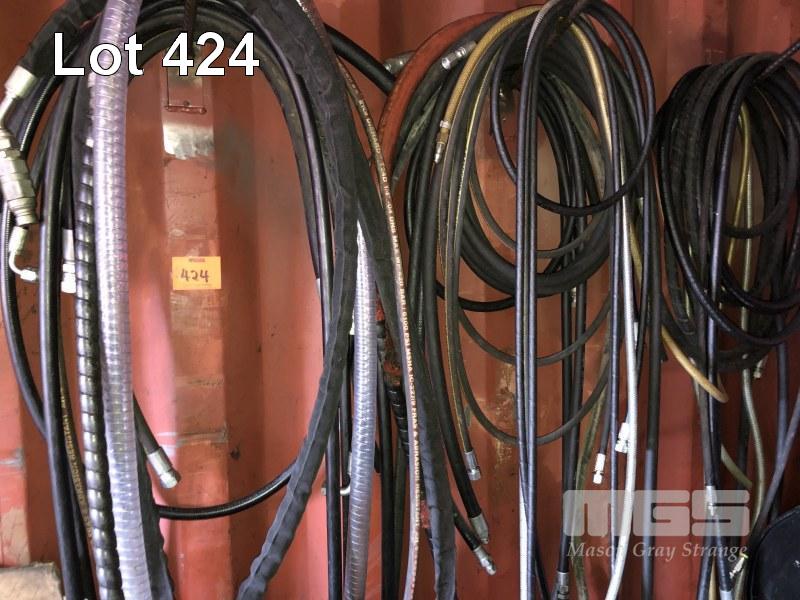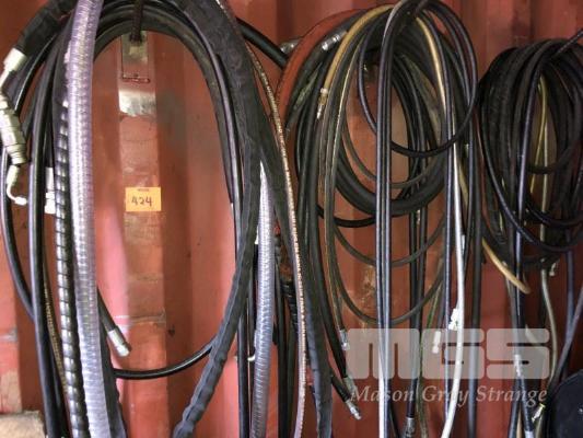 LARGE QUANTITY HYDRAULIC HOSES & FITTINGS, HANGING ON WALL