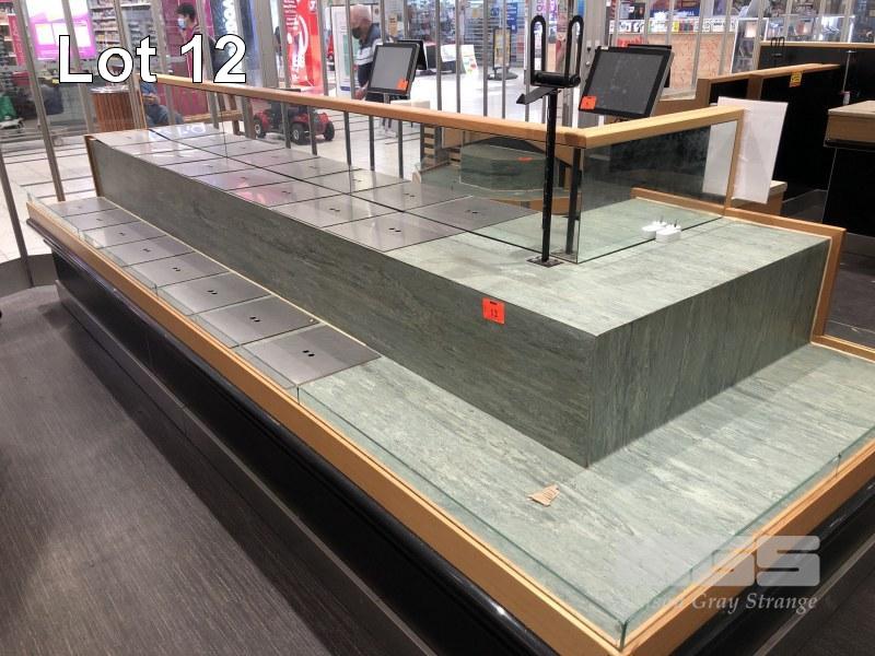 FRUIT & VEG L-SHAPE DISPLAY 4000 x 1450mm VINYL COVERS, 16 x BULK BIN POSITIONERS TIMBER & BLACK LAMINATE SURROUNDS