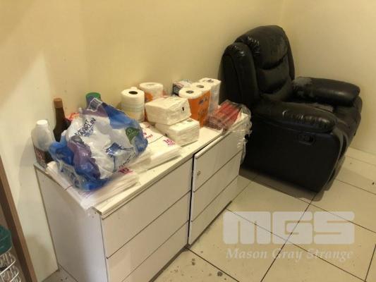 CONTENTS OF ROOM D INCLUDING LOUNGE CHAIR, 2 DOOR CUPBOARD & CONTENTS, TOWELS, GLOVES, OILS, ETC