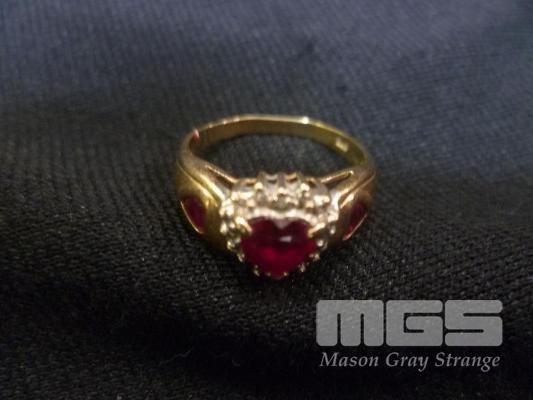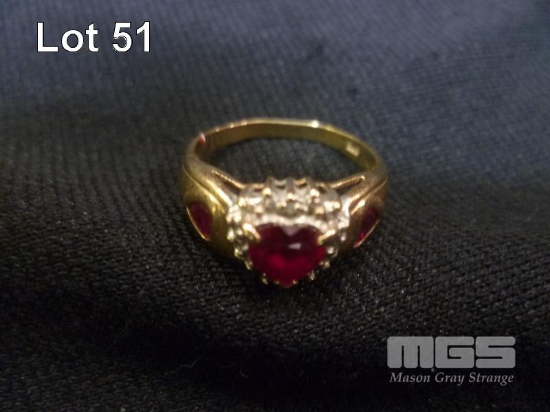GOLD RING, SET WITH 3 X RED HEART SHAPE STONES, MARKED 375, 3.28 grams