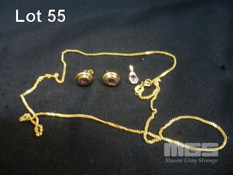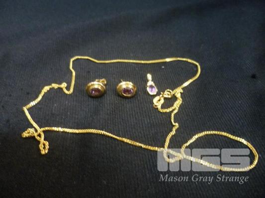 GOLD NECKLACE MARKED ITALY 375, WITH GOLD AMETHYST SET PENDANT MARKED 375 WITH PAIR OF MATCHING EARRINGS, (NO GOLD MARKS)