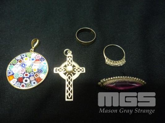 ASSORTED SILVER JEWELLERY, INC; GLASS WITH SILVER FILLED, GOLD TRIM, ROUND PENDANT, MARKED 925 CELTIC CROSS, MARKED 925, SILVER BROOCH WITH PINK STONE, SILVER HALLMARK, SILVER RING SET WITH SMALL CLEAR STONES, MARKED 925, SILVER BAND RING MARKED STERLING 925