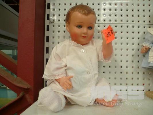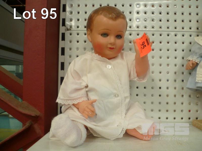 PLASTIC BABY BOY DOLL, WHITE OUTFIT, SITTING HEIGHT 34cm