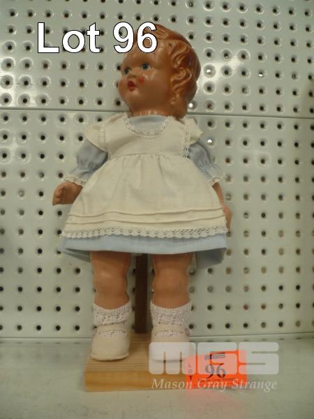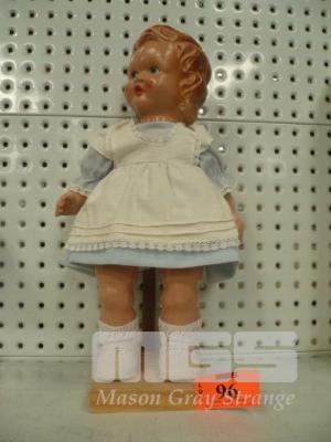 PLASTIC DOLL OF LITTLE GIRL, BLUE/WHITE OUTFIT, (H) 36cm