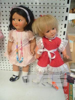2 x PLASTIC DOLLS, YOUNG GIRLS, RED DRESS & PINK DRESS, 45-50cm (H)