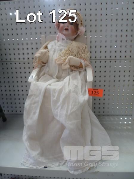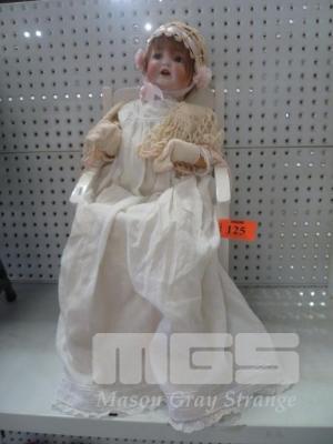 PORCELAIN BABY DOLL, WHITE OUTFIT ON WHITE DOLLS ARM CHAIR