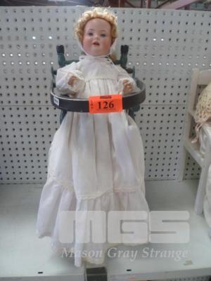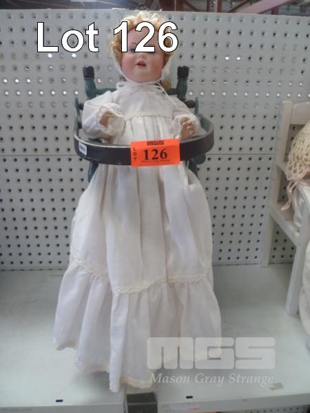 PORCELAIN BABY DOLL, WHITE OUTFIT ON DOLLS HIGH CHAIR