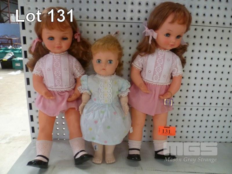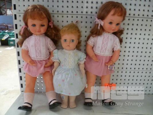 3 x RUBBER DOLLS, YOUNG GIRLS, BLUE & PINK DRESSES, 41-52cm (H)