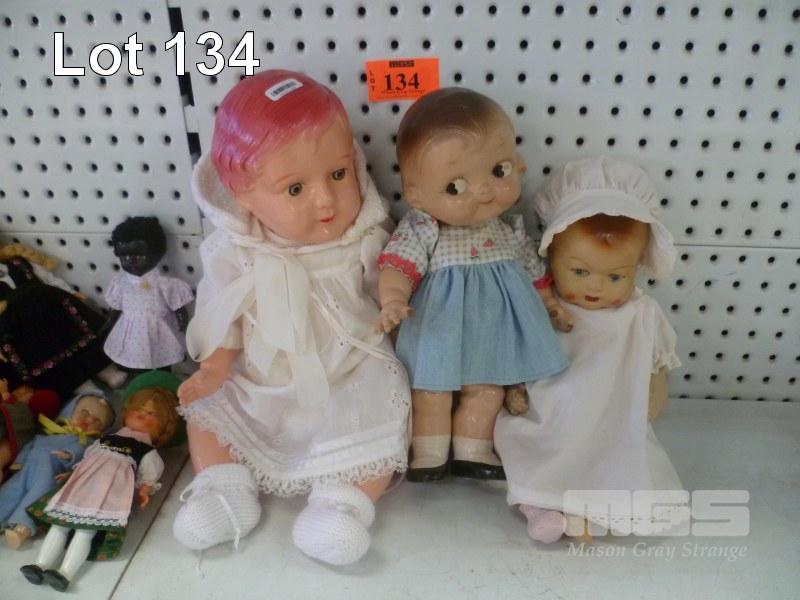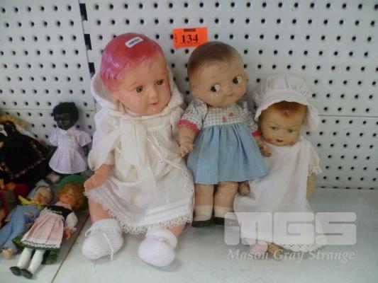 3 x VINTAGE BABY DOLLS INC THIN PLASTIC ABAY, WHITE OUTFIT, BABY GIRL, BLUE DRESS, EYES RIGHT & PORCELAIN BABY GIRL, WHITE OUTFIT