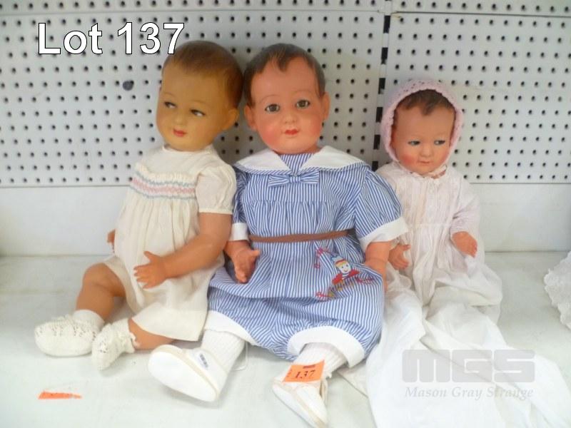 3 x PLASTIC BABY DOLLS INC BOY IN BLUE/WHITE OUTFIT, GIRL IN WHITE DRESS & GIRL IN WHITE DRESS & PINK BONNET