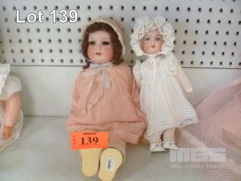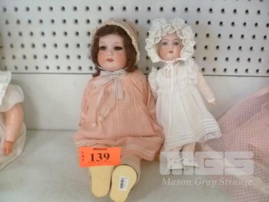 2 x PORCELAIN DOLLS, YOUNG GIRLS, GIRL IN WHITE OUTFIT ON STAND, 28cm (H) & GIRL IN PINK OUTFIT, 43cm (H)