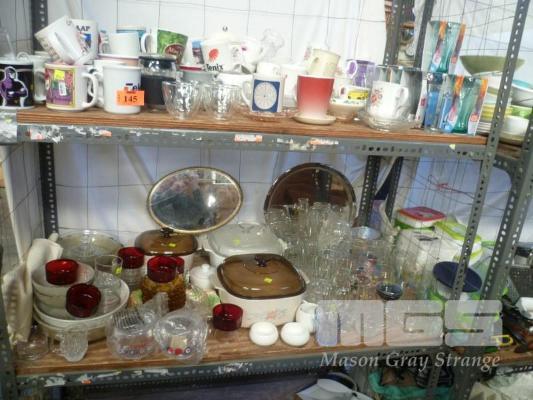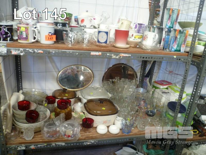 ASSORTED GLASSWARE, COOKWARE, MUGS, ETC, 2 x BAYS