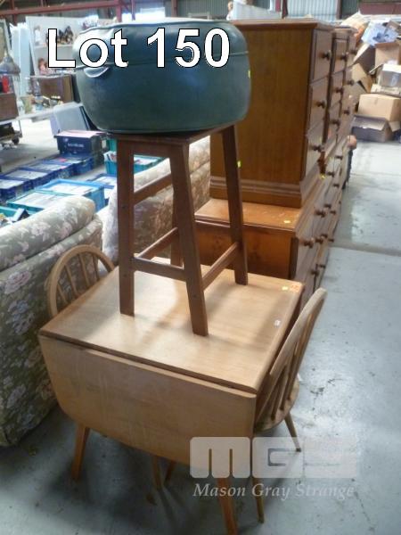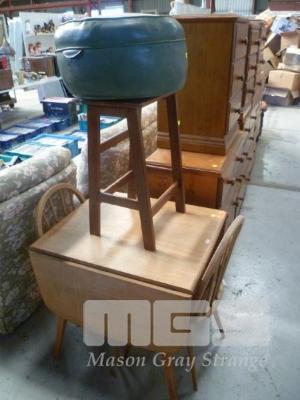 TIMBER DROP SIDE DINING TABLE, PAIR ARCHED BACK DINING CHAIRS, STOOL & GREEN VINYL POUFFE