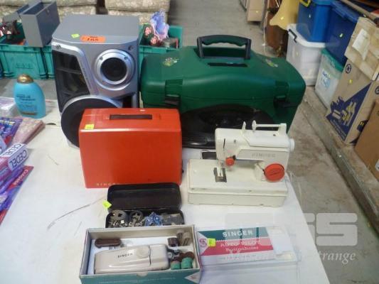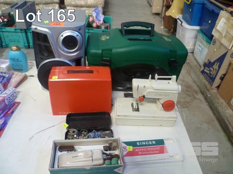 VINTAGE SINGER "AUTO-PILOT" AUTOMATIC BUTTONHOLER IN ORIGINAL PACKAGING, CHILDREN'S SINGER SEWING MACHINE (MODEL 67B), "VB" RADIO COOLER AND SINGLE SPEAKER