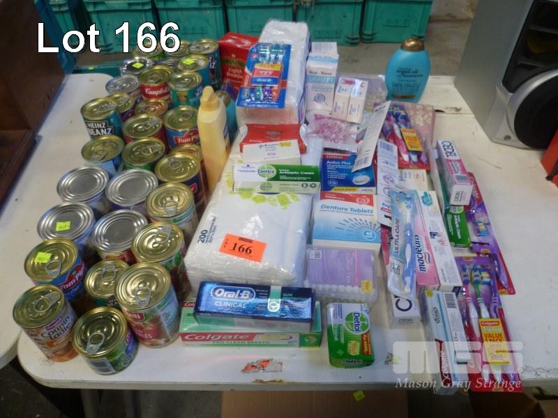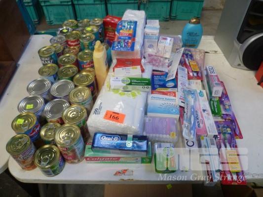 HOUSEHOLD CONSUMABLES INCLUDING TOOTHPASTE, TOOTHBRUSHES, PAPER TOWELS, TINNED FOODS ETC. 2 x BOXES OF LINEN (UNDER TABLE).