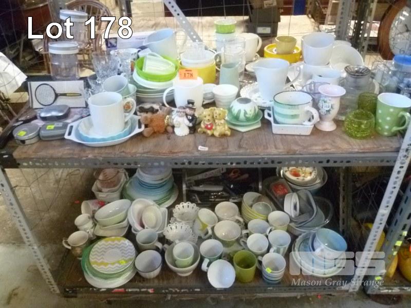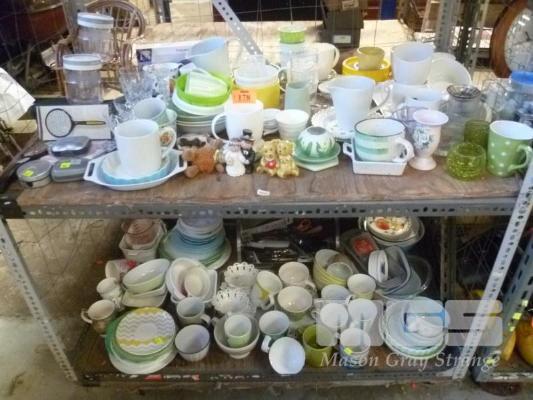 ASSORTED CROCKERY, DOLLS CANE CHAIR, COOKWARE, ETC, 2 x BAYS