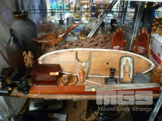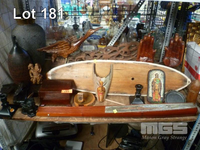 COLLECTABLE WOODEN OBJECTS INCLUDING ENORMOUS PAPER FAN, VINTAGE SAILING BOAT HULL, PROJECTILE CONTAINER, BOOKENDS, JEWELLERY BOX. CARVED WOODEN ELEPHANT WALL HANGING, THREE MONKEYS ASHTRAY, GIANT CRANE FIGURE, LARGE CARVED WOODEN HANDS AND CARVED WOODEN LACE WORK PIECES ETC. ALSO CERAMIC "AUSTRALIAN MADE" CANDLESTICK HOLDERS, FLOOR VASE, ORNAMENTAL GOURD.
