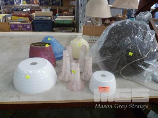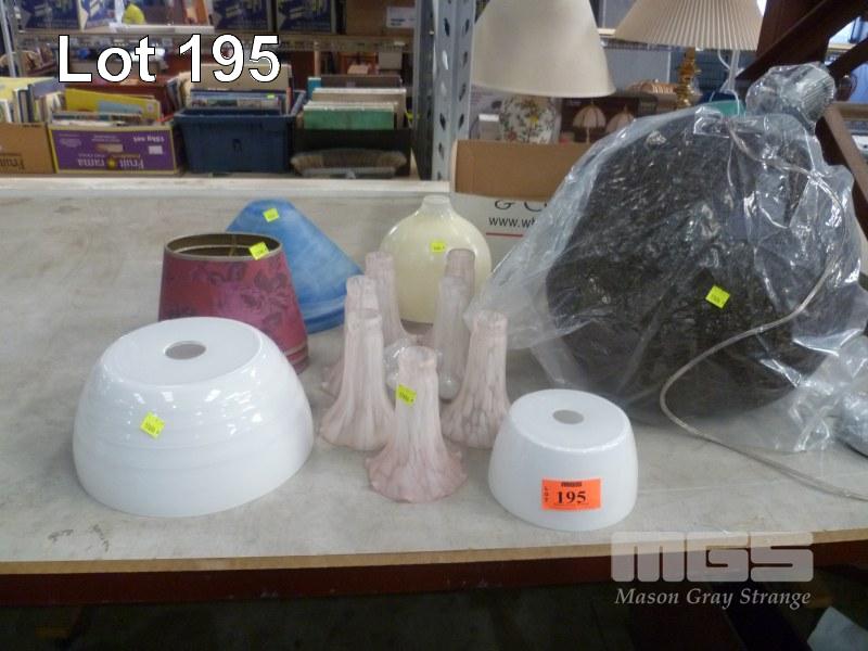 STRING CEILING LAMP, "FLOWER" LAMPSHADES AND ASSORTED GLASS LAMP SHADES.