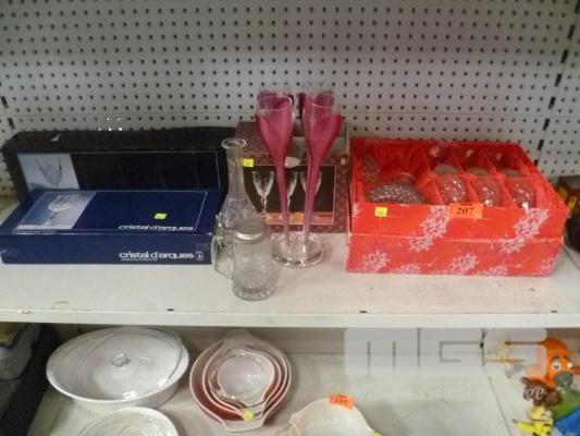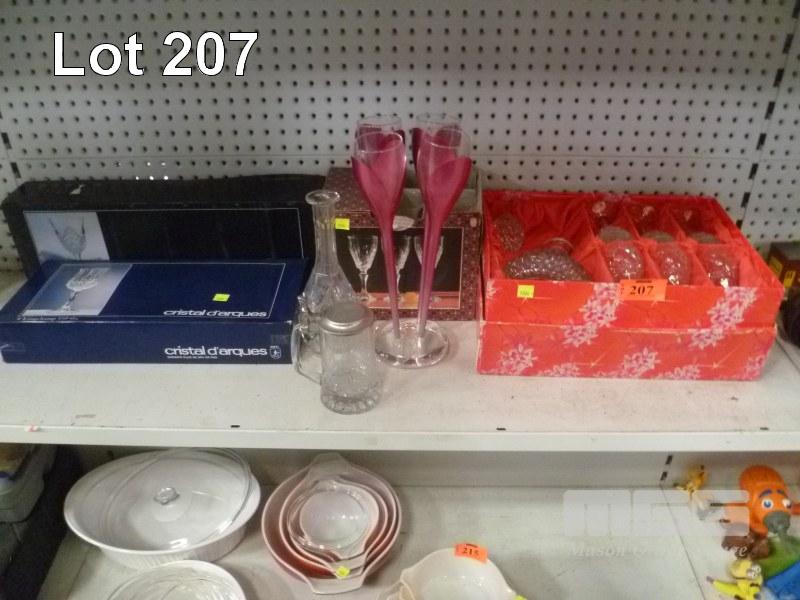 CRYSTAL SETS INCLUDING CRISTAL D'ARQUES WINE GLASSES IN ORIGINAL BOXES, CHAMPAGNE GLASSES, BOHEMIA DECANTER & GLASS SET AND DECANTER, BEER STEIN. ALSO SET OF NOVELTY "MOET & CHANDON" LONG STEM BASELESS CHAMPAGNE FLUTES.