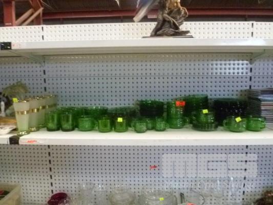 GREEN GLASS DINNER SET AND FROSTED GLASS HIGH TOP GLASSES