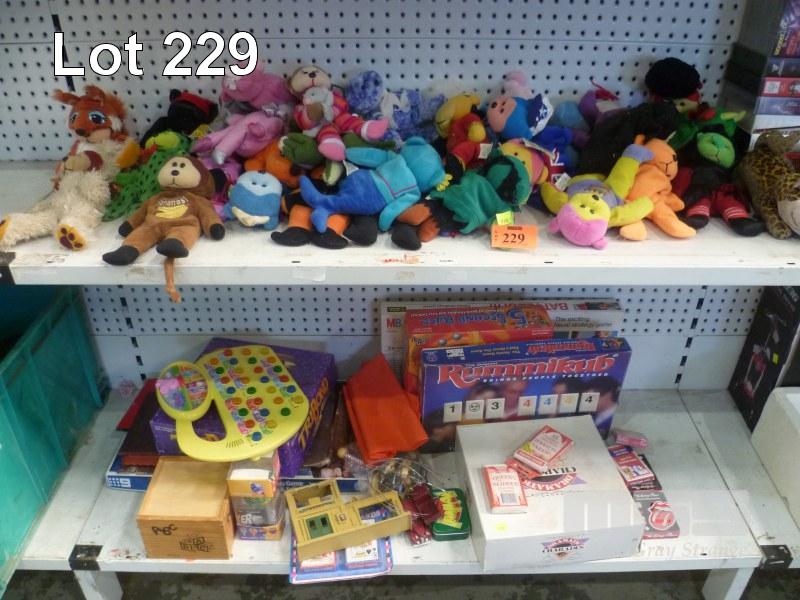 ASSORTED SOFT TOYS & GAMES, 2 x SHELVES