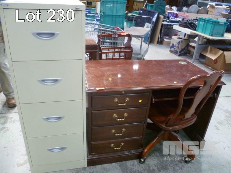 OFFICE SUITE COMPRISING POLISHED TIMBER, 4 DRAWER DESK WITH BRASS HANDLES, TIMBER OFFICE CHAIR & BEIGE 4 DRAWER FILING CABINET