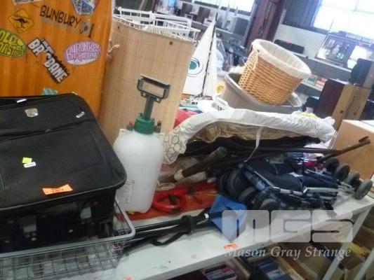 ASSORTED HOMEWARES SUITCASES, IRONING BOARD, LAUNDRY BASKETS, VOLTA VACUUM, ETC, 1 x TABLE