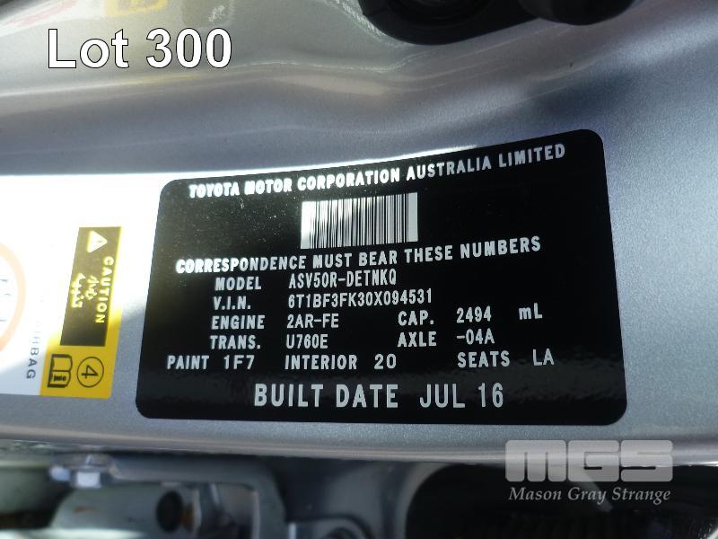 2016 TOYOTA CAMRY ATARA SL SEDAN REG: S873 BLT (SA) (EXPIRED) VIN: 6T1BF3FK30X094531 ENG: 2ARU357301 ODO: 50,741 KM 2.5 LITRE, AUTOMATIC, PETROL, SILVER, 4 DOORS, 5 SEAT, ABS, AIR BAG, AIR CON, ALLOY WHEELS, BLUETOOTH, CENTRAL LOCKING, CRUISE CONTROL, POWER STEERING, POWER WINDOWS, SPARE WHEEL, TOW BAR, TRACTION CONTROL (WITH 1 KEY/S, WITH OWNER'S MANUAL, WITH SERVICE BOOKS) CONDITION: PASSENGER SIDE - REAR DOOR & REAR GUARD DAMAGED