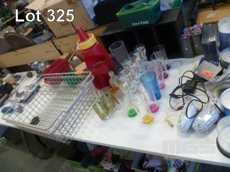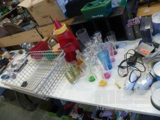 ASSORTED GLASSWARE, BLANK CD's, ETC