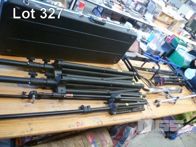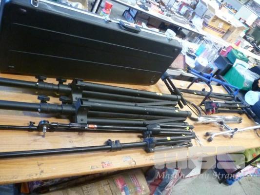 GUITAR STANDS, MIC STANDS, SPEAKER STANDS, KEYBOARD STAND & ELECTRIC GUITAR HARD CASE, 1 x TABLE